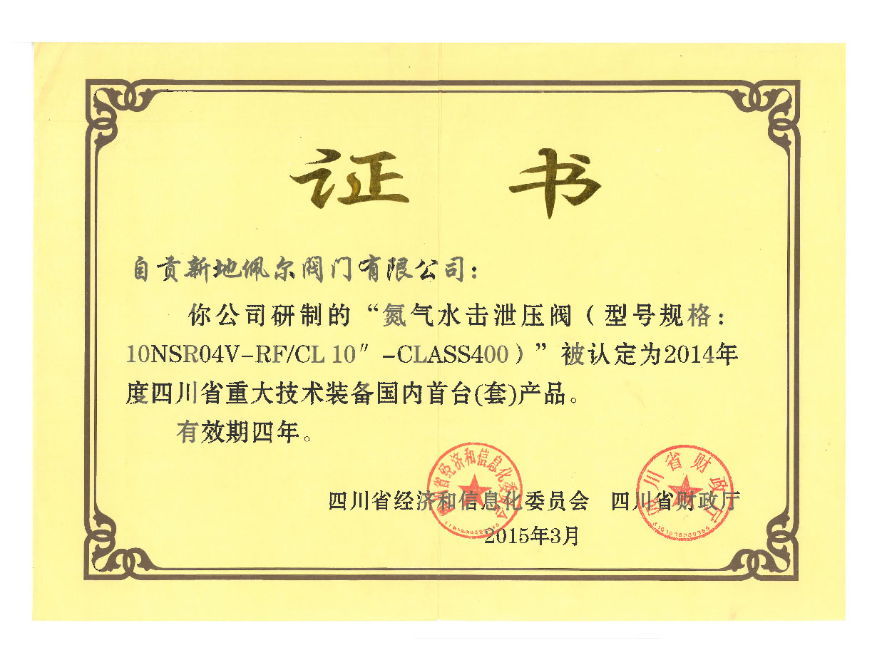 03月 我公司生產的氮氣式水擊泄壓閥被四川省評委“2014年度四川省重大技術裝備國內首臺/套產品”